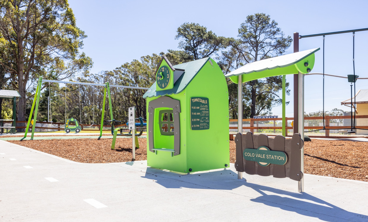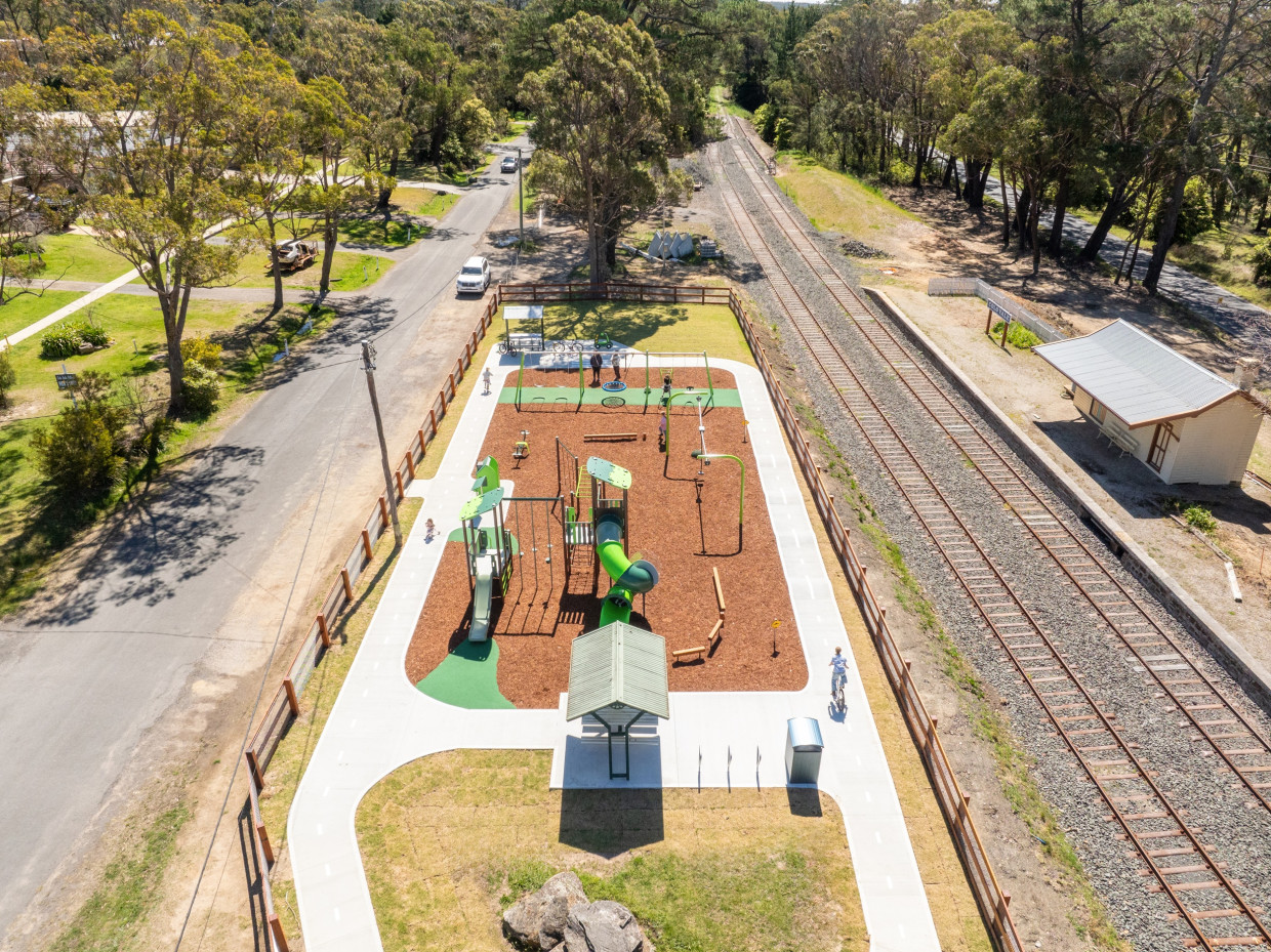 The playground at Colo Vale sits alongside the original rail line that once connected the town to the wider region. The challenge was to acknowledge this history without turning the site into a novelty attraction. Working with Wingecarribee Shire Council, the brief focused on movement, accessibility, and everyday community use.