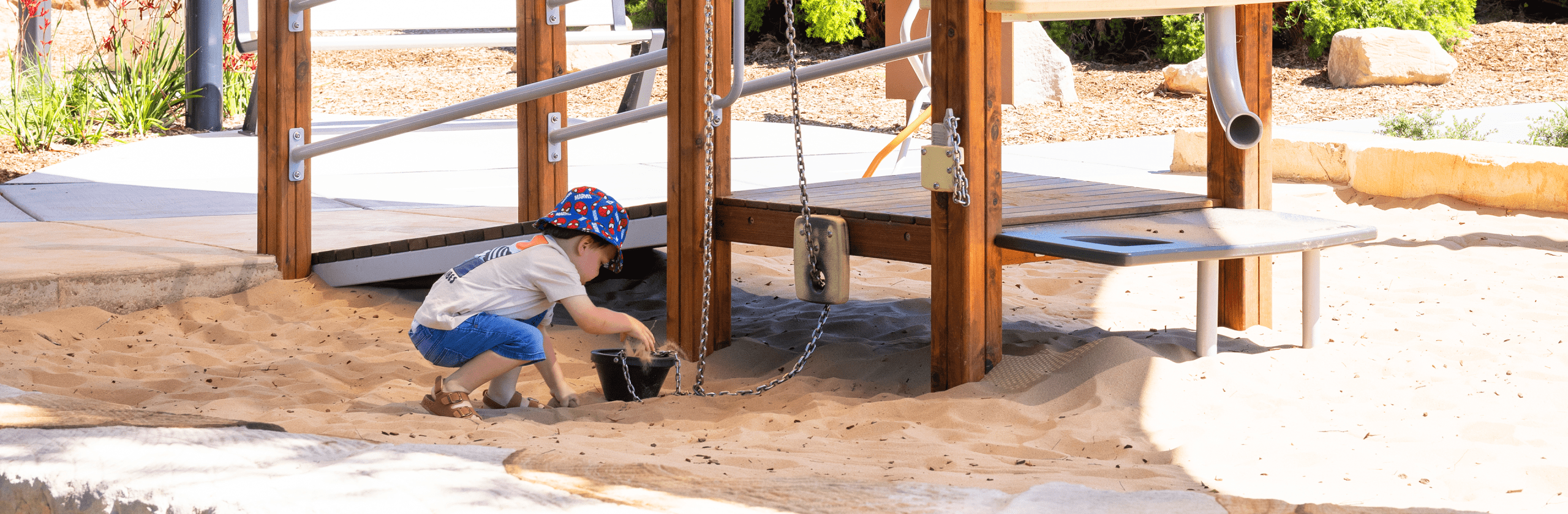 Sand and water play supports participation through tactile interaction, shared surfaces, and ground level access, allowing children to engage at their own pace.