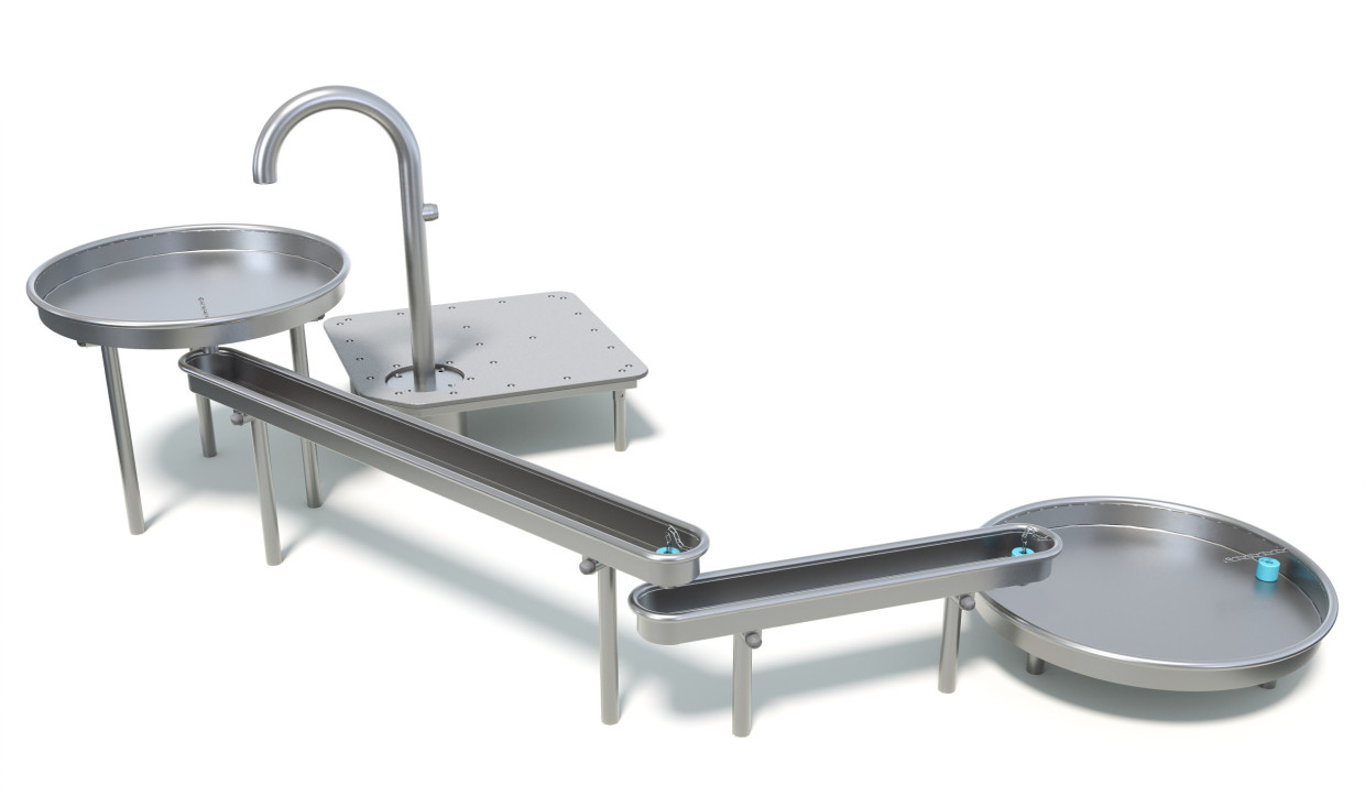 Featuring a push-button water tap, Coil sends water racing through two paths before it spills into the final tray. Plugs along the way let children hold back the flow and unleash one big whoosh when they are ready.