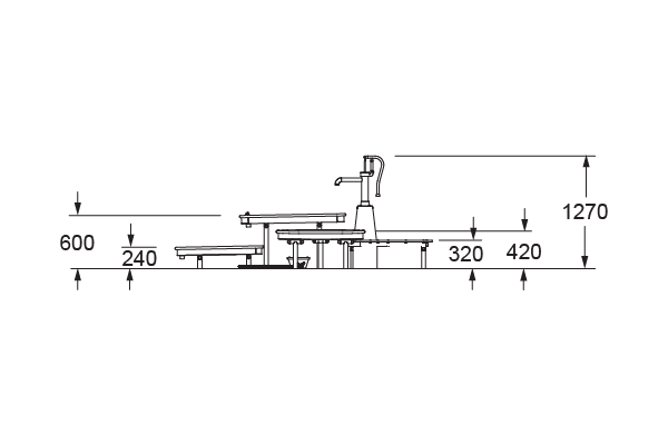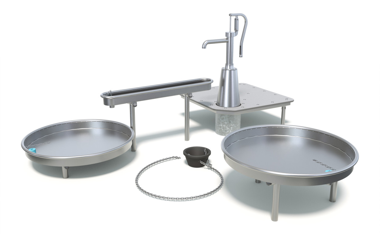 Featuring a manual water pump, Island sends a single stream into a plug tray for holding and releasing water. A second tray and fixed bucket invite kids to scoop, pour and experiment as they move water between each point. It turns simple actions into a fun exploration of flow and release.