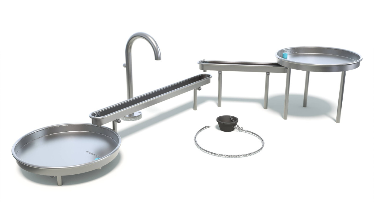 Featuring a push-button tap, Relay invites kids to scoop water from the fixed bucket and pour it into the top tray to get everything moving.
