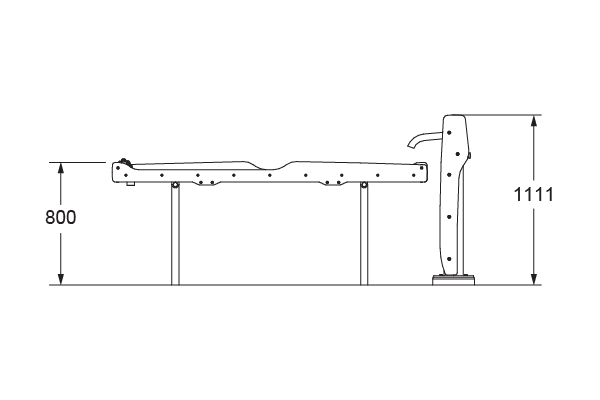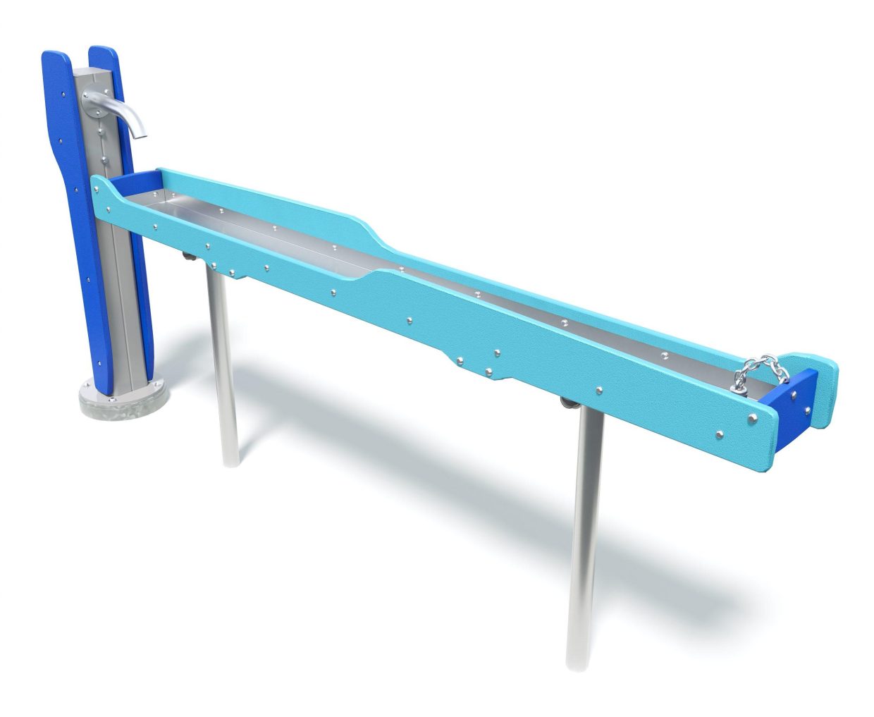 Wellington features one long water stream, creating a simple linear play path for splashing, scooping and flowing water play. A timed push button is located on the back of the tap for controlled water flow.